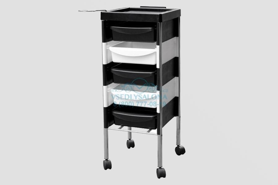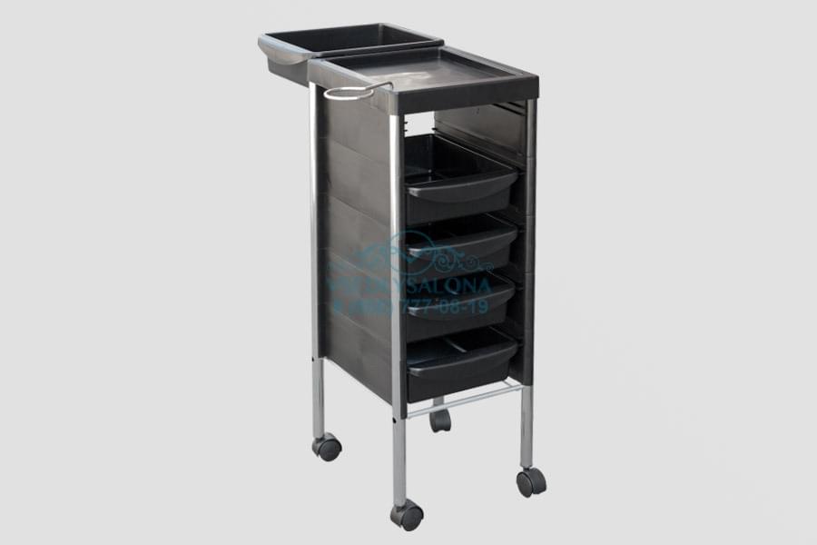 Парикмахерская тележка Т-30 оснащена глубокими и вместительными ящиками для парикмахерских принадлежностей, а также фенодержателем для еще большего удобства работы. Она выполнена в классическом черном цвете, что делает ее универсальной моделью практически для любой современной парикмахерской или барбершопа.