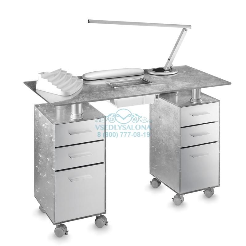Маникюрный стол «Хирономо» - для тех, кто ищет по-настоящему изысканные решения для своего маникюрного салона или кабинета. Оригинальная форма столешницы, хромированные ножки, вместительная тумба – все это здесь. На нижней полке может быть установлена вытяжка для еще более комфортной работы мастера маникюра.