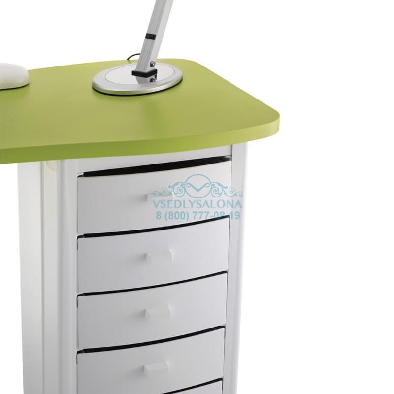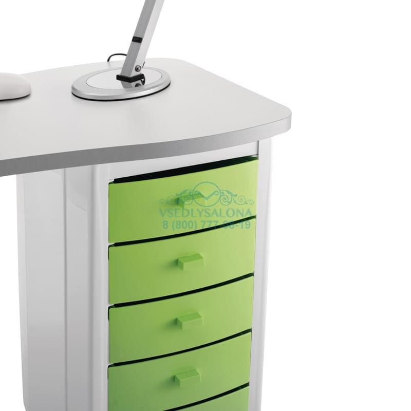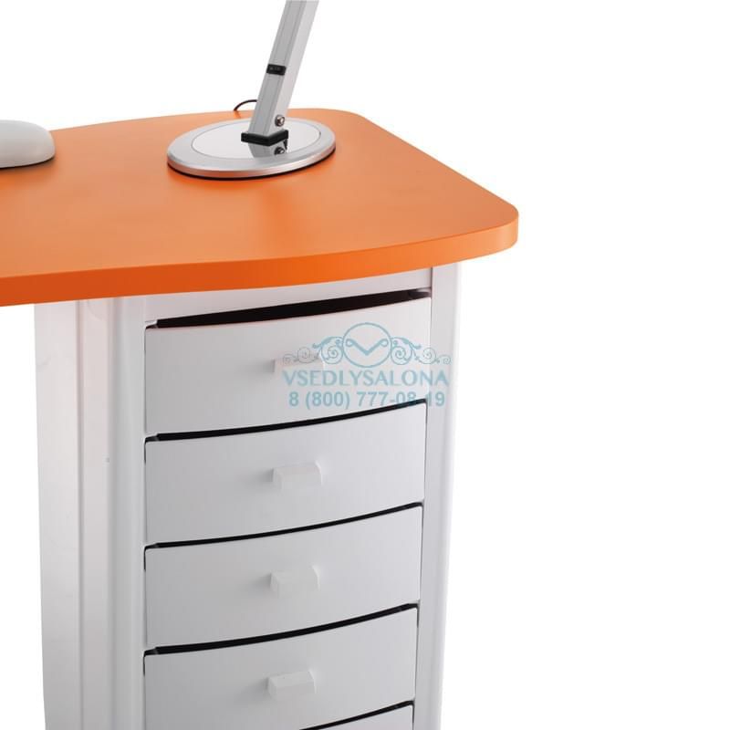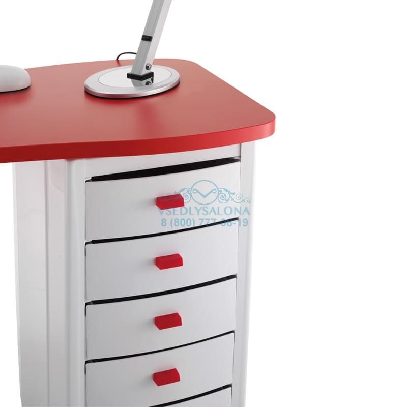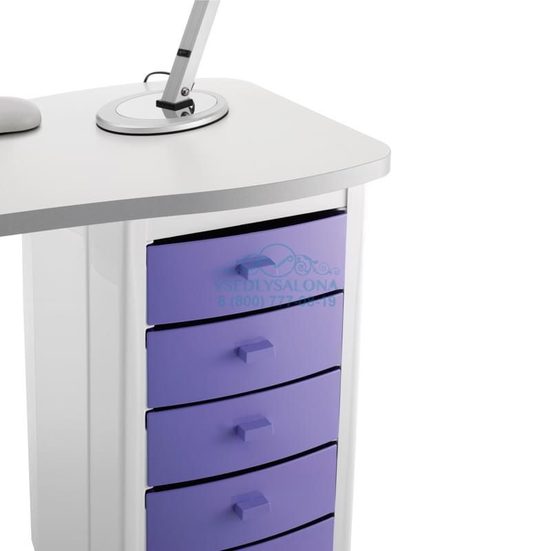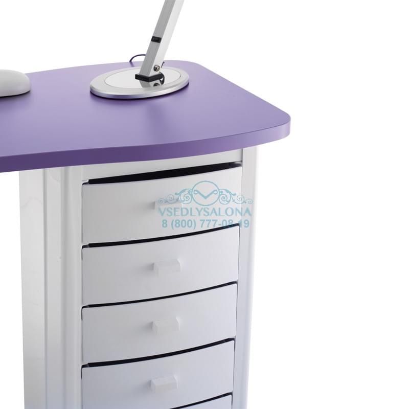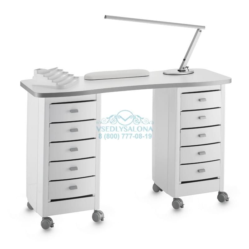 Маникюрный стол с двумя тумбами, столешница ламинированная, тумбы пластиковые с выдвижными ящиками, на колесах. В комплекте: лампа, подушка маникюрная, подставка под лаки.