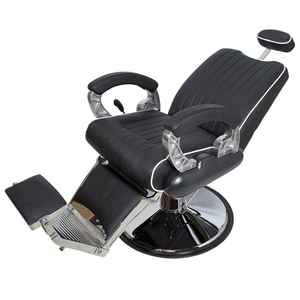 Кресло раскладывается до полулежащего положения для комфортной и безопасной процедуры бритья. Для наклона подставки под ноги и спинки установлена пневматика (ручка с правой стороны). Высота сиденье регулируется с помощью надежного усиленного гидравлического механизма, для управления которым в комплекте идет удобная педаль.