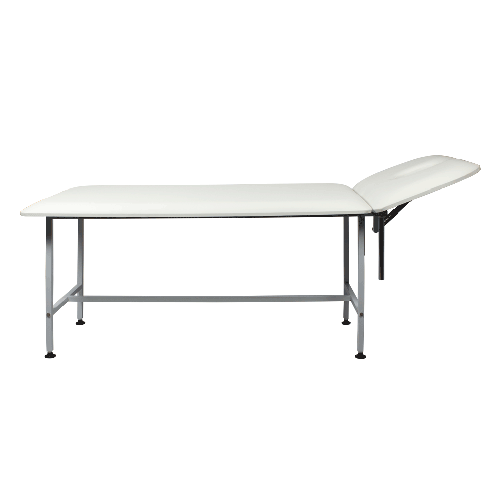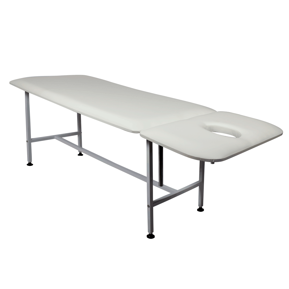 Неоспоримым преимуществом данной модели кушетки является надежный металлический каркас, который обеспечивает необходимую устойчивость даже при больших нагрузках. Для защиты от коррозии он окрашен порошковой краской белого цвета. Ножки каркаса установлены на специальные подпятники. Учитывая специфику массажных процедур, в подголовнике кушетки предусмотрено отверстие для лица. Для дополнительного удобства клиентов мастер сможет отрегулировать наклон подголовника с помощью механического рычага.
