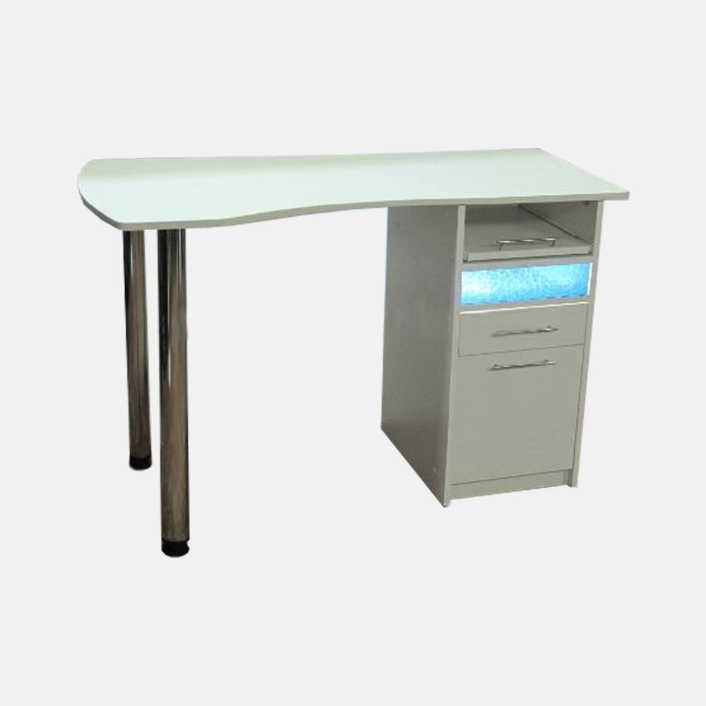 Маникюрный стол «Хирономо» - для тех, кто ищет по-настоящему изысканные решения для своего маникюрного салона или кабинета. Оригинальная форма столешницы, хромированные ножки, вместительная тумба – все это здесь. На нижней полке может быть установлена вытяжка для еще более комфортной работы мастера маникюра.