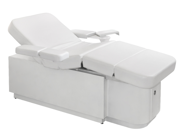 Высота, спинка и ножки регулируются электрически, белая прорезиненная ванна для педикюра, подлокотники со строенной чашей для маникюра как опция