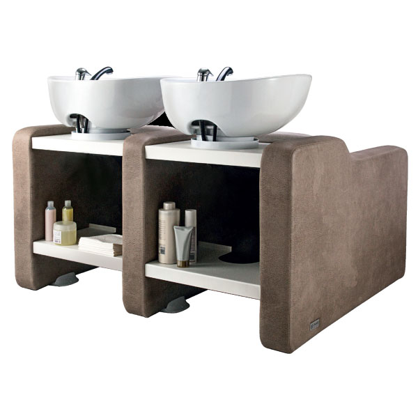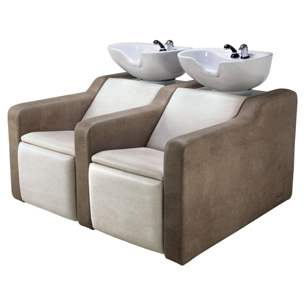 Двойная мойка, с металлическими полками для шампуней. Мойка комплектуется глубокими керамическими раковинами с регулировкой угла наклона и комплектами смесителей. Кресла оснащены массажем и электрическим подъемом подножных частей. Мягкие элементы кресел обтянуты искусственной кожей высшего качества, мягкие подлокотники.