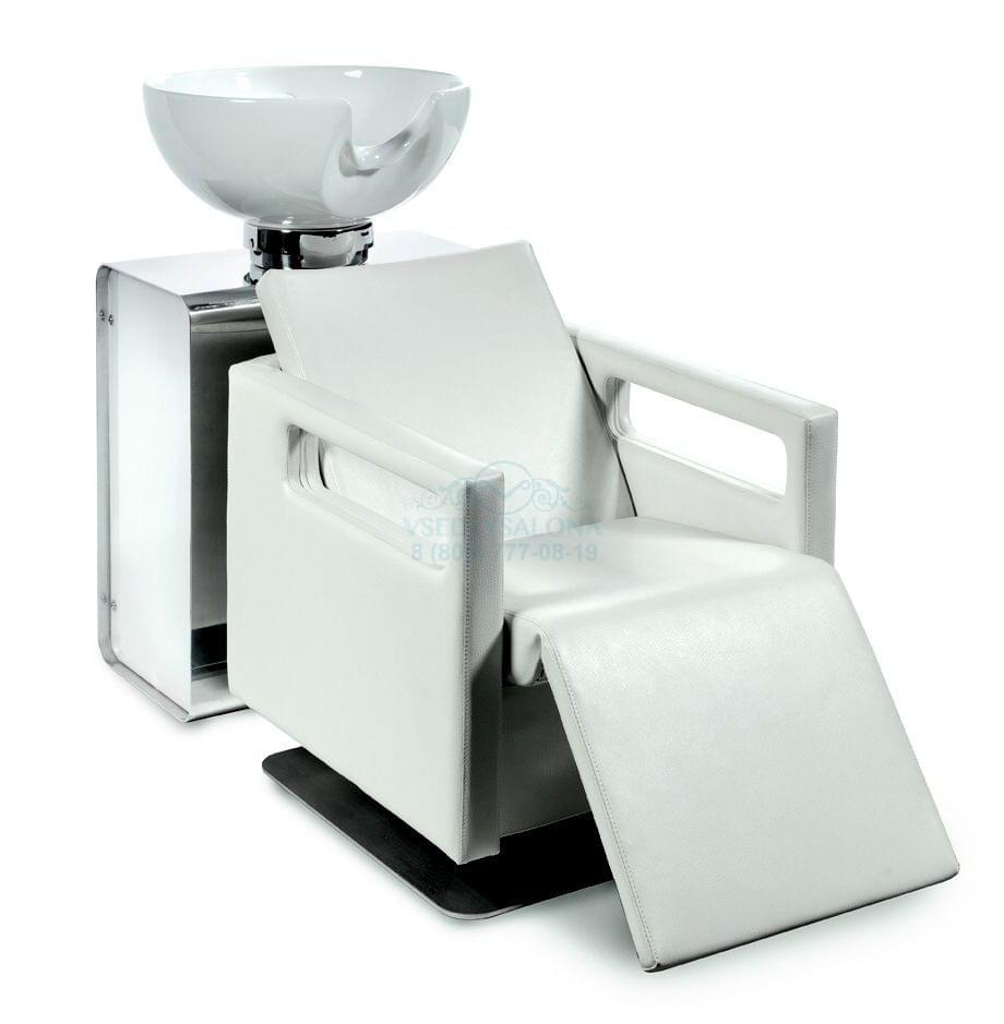 Мойка на стойке из полированного алюминиевого каркаса с боковыми вставками из органического стекла, комплектуется глубокой керамической раковиной белого цвета с регулировкой угла наклона, комплект смесителя с хромированной лейкой душа. Кресло стоит самостоятельно на квадратном основании. Удлиненная подножная часть кресла регулируется по высоте с помощью ручного пульта управления и создает релаксирующий эффект для клиента. Мягкие элементы кресла с подлокотниками обтянуты искусственной кожей высшего качества. Размер (ДхШхВ):120х65х106