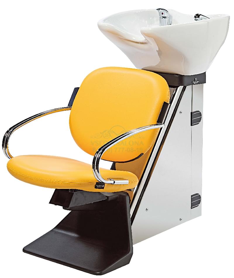 Мойка с креслом на алюминиевом каркасе. Комплектуется средней, глубокой керамической раковиной белого или черного цвета, с регулировкой угла наклона, комплектом смесителя с хромированной лейкой душа. Каркас кресла выполнен из металла, мягкие элементы обтянуты искусственной кожей высшего качества, подлокотники хромированные, или с деревянной накладкой.