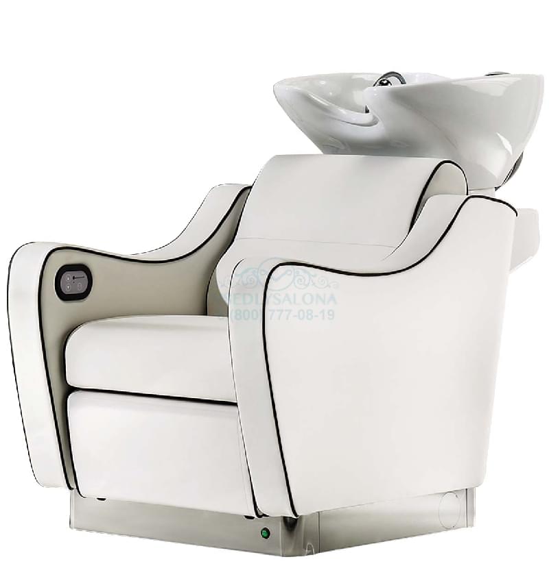 Мойка с креслом, каркас белый или чёрный. Отличается наличием декоративных швов. Комплектуется глубокой керамической раковиной белого или чёрного цвета, с регулировкой угла наклона, комплектом смесителя с хромированной лейкой душа. Мягкие элементы обтянуты искусственной кожей высшего качества, мягкое широкое кресло, возможен вариант с электрической подножкой, легкое управление с помощью пульта, а также с воздушным массажем спины. В наличии цвет: S78 белый рисунок/ швы чёрные. Цена указана на мойку в наличии, с электрической подножкой, белым каркасом и средней раковиной белого цвета.