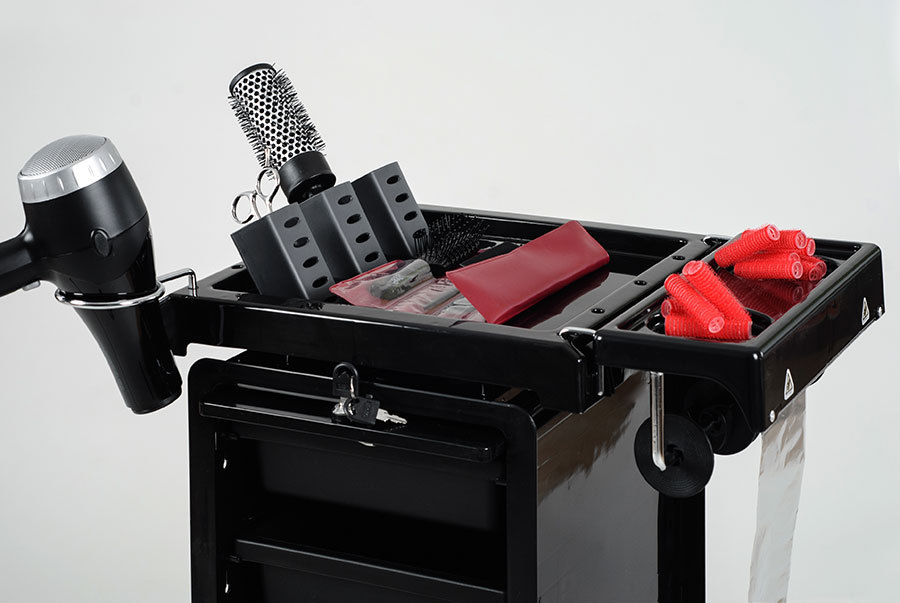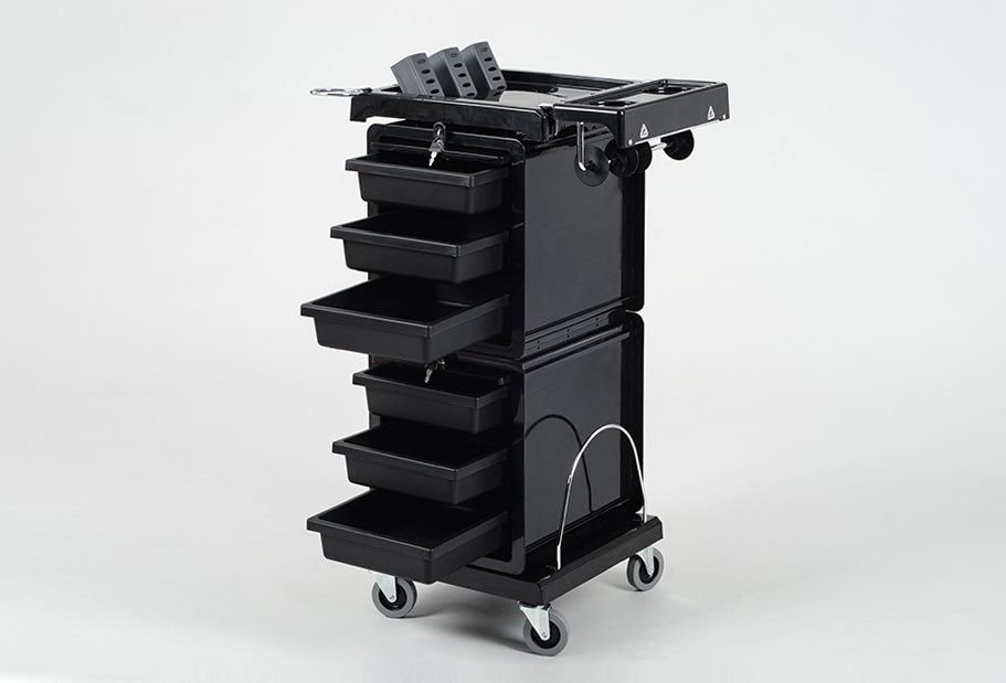 Компактная многофункциональная парикмахерская тележка "QA0013" выполнена из прочного пластика, стойкого к воздействию косметических красок, а прорезиненные колеса обеспечивают легкое и бесшумное передвижение тележки. Столешница поделена на секции и имеет специальные стаканы для горячих ножниц и выпрямителей. Тележка оснащена внешним держателем для фена и специальным держателем для фольги. Для хранения инструментов предусмотрены шесть выдвижных ящиков, которые, при необходимости, легко вынимаются и надежно фиксируются на столешнице. Секции с ящиками запираются на ключ. Для каждой секции предусмотрен свой ключ, что делает возможным использование тележки QA0013 сразу на два рабочих места парикмахера. На нижней платформе можно разместить высокие емкости, хромированные бортики надежно фиксируют бутыли и не позволяют им упасть.