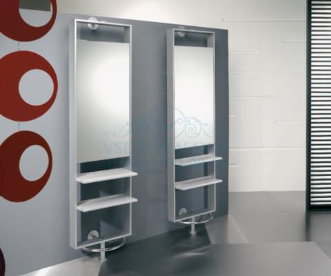 Зеркало парикмахерское настенное, в раме светло-серого цвета, возможность поворачивать зеркало, поднимать и опускать полки.