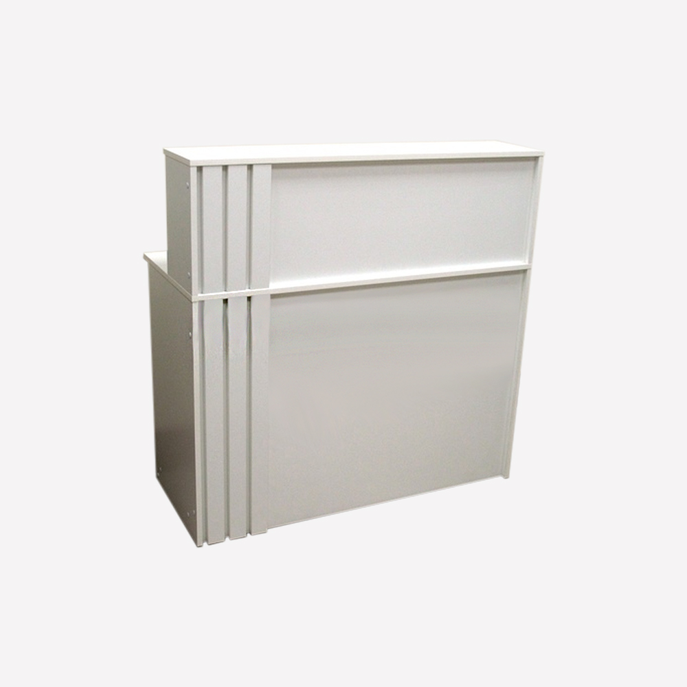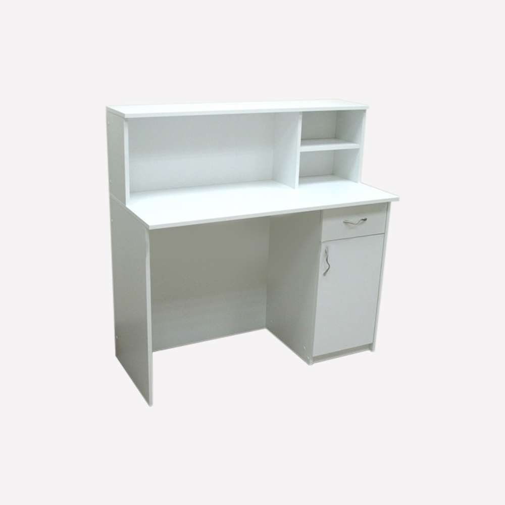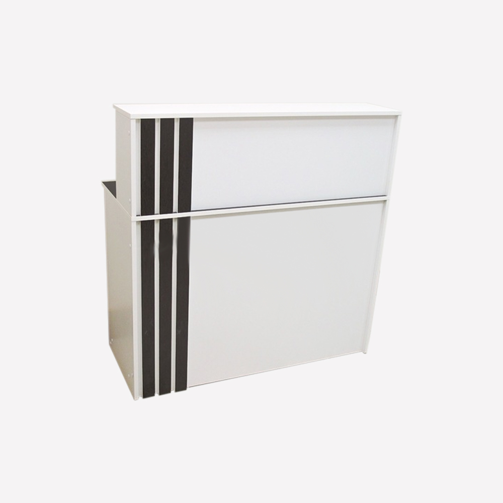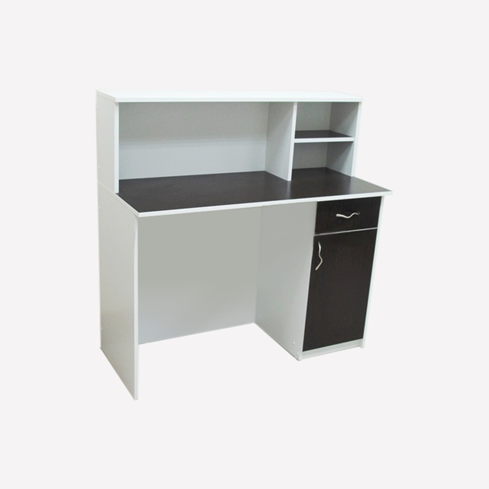 Со стороны персонала располагается столешница с отделением для ноутбука или компьютера и две открытые полки. Под столешницей размещается тумба с одним выдвижным ящиком и распашным шкафом. Возможно право- или левостороннее размещение полок и тумбы. Компания осуществляет изготовление по требующимся размерам и в любом цвете ламинированного ДСП.