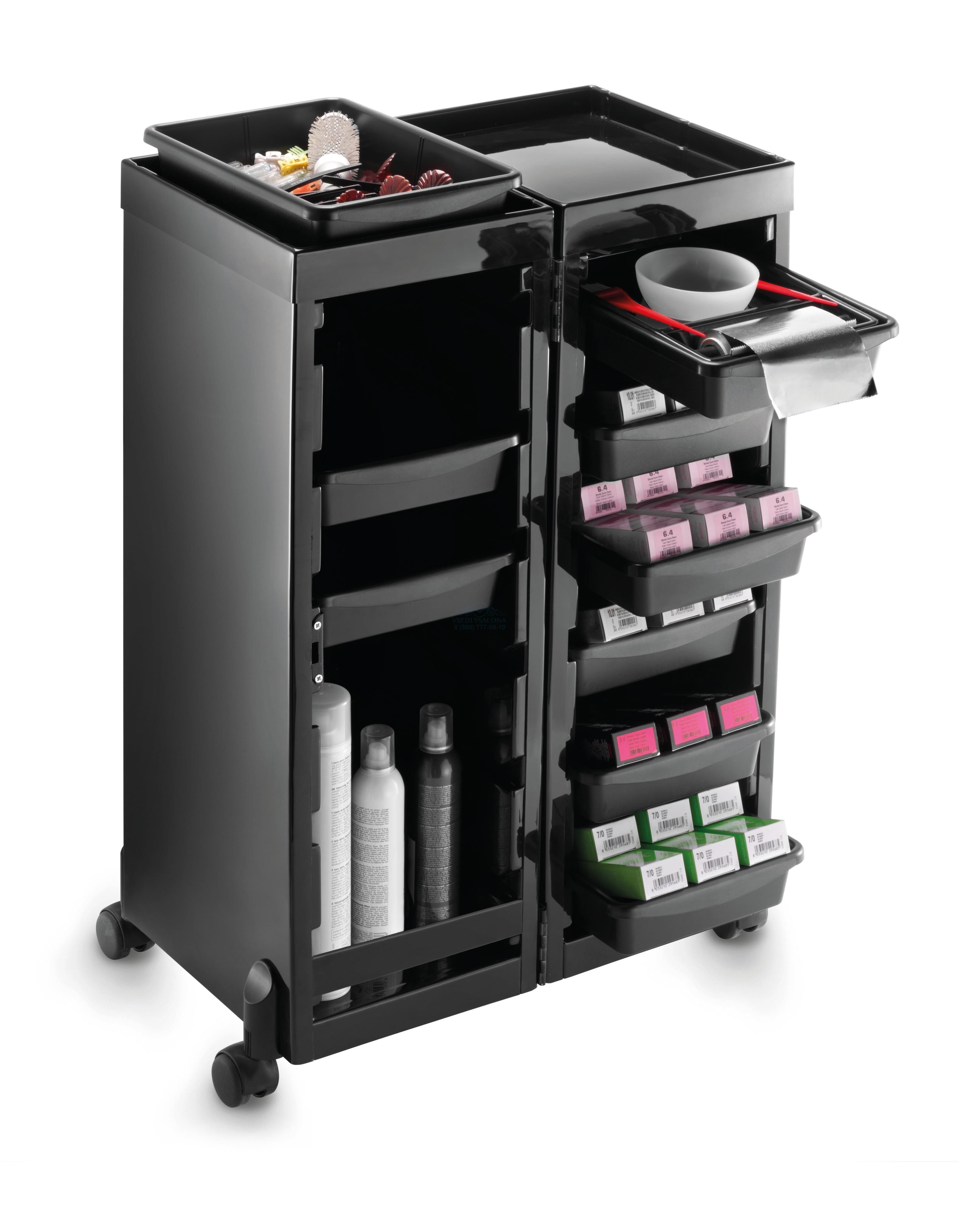 Тележка парикмахерская двойная. Выполнена из пластика, на колесиках, с выдвижными ящиками. Цвет: черный.