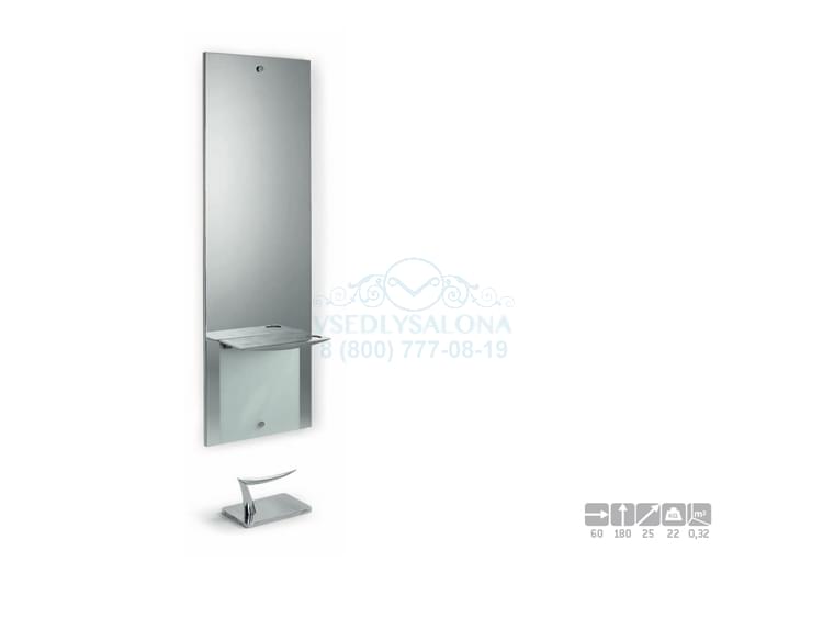 Зеркало парикмахерское прямоугольной удлиненной формы, с плоской прямоугольной столешницей из полированного алюминия с отверстием для фена, нижняя часть зеркала имеет вставку из матового стекла. Подставка под ноги заказывается отдельно, как дополнительная опция. Зеркало крепится к стене. Размер (ДхШхВ):60х26х211,5
