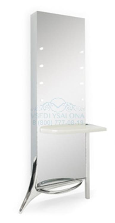Зеркало парикмахерское, одностороннее, крепление к стене. Металлическая хромированная подставка под ноги, подсветка фасада, столешница из белого пластика. Размер: 92х36х201