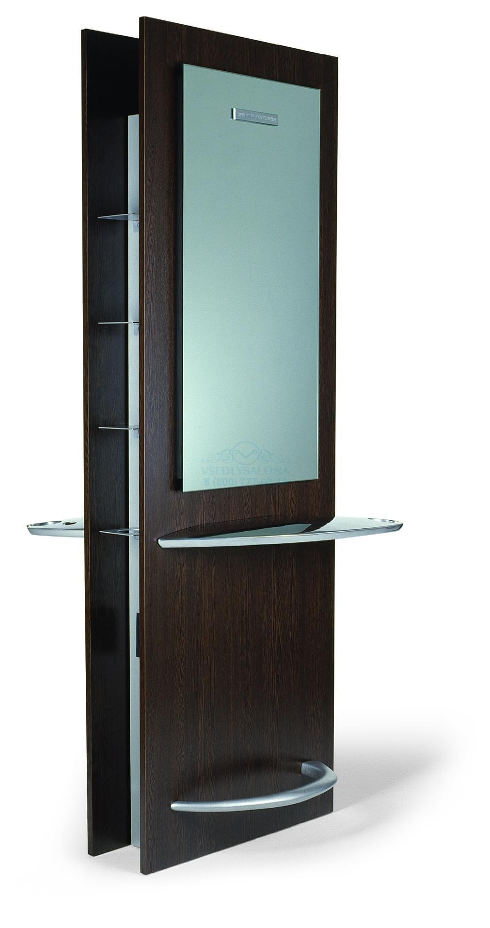 Модель включает в себя два зеркала, две полочки для инструментов и материалов с нишей для фена и две подножки. Дополнительным преимуществом служит наличие боковых полочек с двух сторон, где можно держать различные принадлежности для работы и иметь к ним постоянный доступ. Столешница металлическая, рама выполнена из ламината, основное фронтальное полотно – дерево.